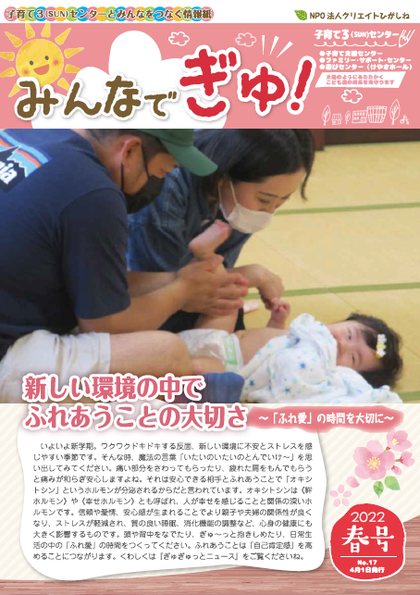 そのSUNセンターのことをみなさんへお伝えしていくために、3センター合同の情報紙を年4回発行する運びとなりました。みんなで“ぎゅ!”と子育てSUNセンターをよろしくお願いします。